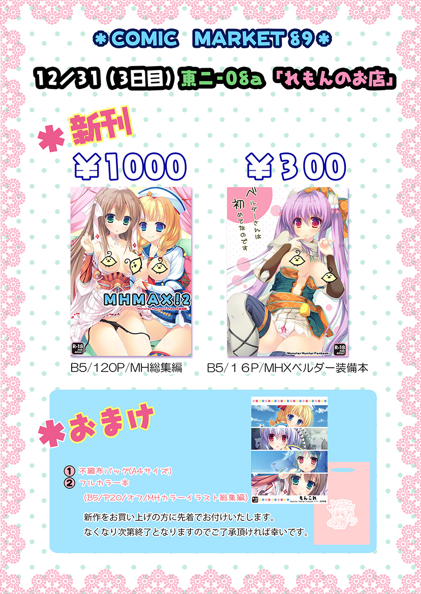![]() ◆スペース れもんのお店 東ニ-08a ◆ 新刊情報詳細 ![]() *おまけはなくなり次第終了となります。ご了承下さいませ。 ◆サンプル等新刊詳細 ◆書店委託 「MHMAX!2」※R-18 「ベルダーさんは初めてなのです」※R-18 既刊は ・MHMAX! ・HUNTER PLAY★G ・うちの榛名さん を持っていきます! ◆当日について ・毎回小銭をご用意頂いていてとても助かっております! 今回も小銭は多めにご用意しておりますが、なるべくお釣りのないようにご用意していただけますと非常に助かります。 ・当サークルの発行物は全て18禁になります。年齢確認のため身分証等の提示をお願いする可能性があります。その際はご協力頂ければ幸いです。 ◆ スケブについて 大きいイベントではやっておりませんすみませんm(_ _)m ◆展示ポスターについて 欲しい方がいたら14時あたりに声かけてみてください。先着で差し上げます ![]() |